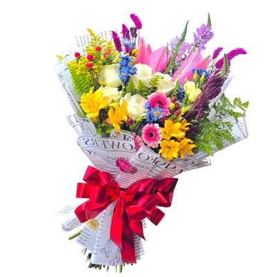 Majestoso buquê, no estilo coreano, colorido com flores selecionadas do dia,podendo haver mudanças conforme estoque, respeitando a paleta de cores. Embrulhada no papel jornal, para todas as ocasiões