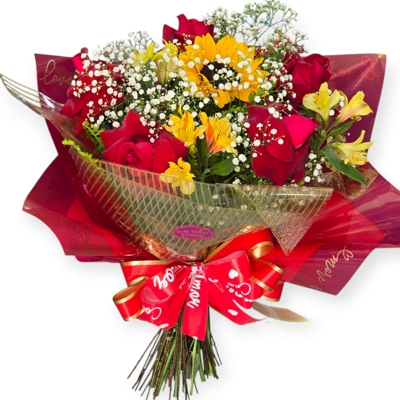Um lindo buquê de 6 rosas vermelhas com girassol, cor da rosa e do embrulho poderá ser alternado se a escolha for do cliente, nos mandar mensagem pelo WhatsApp.